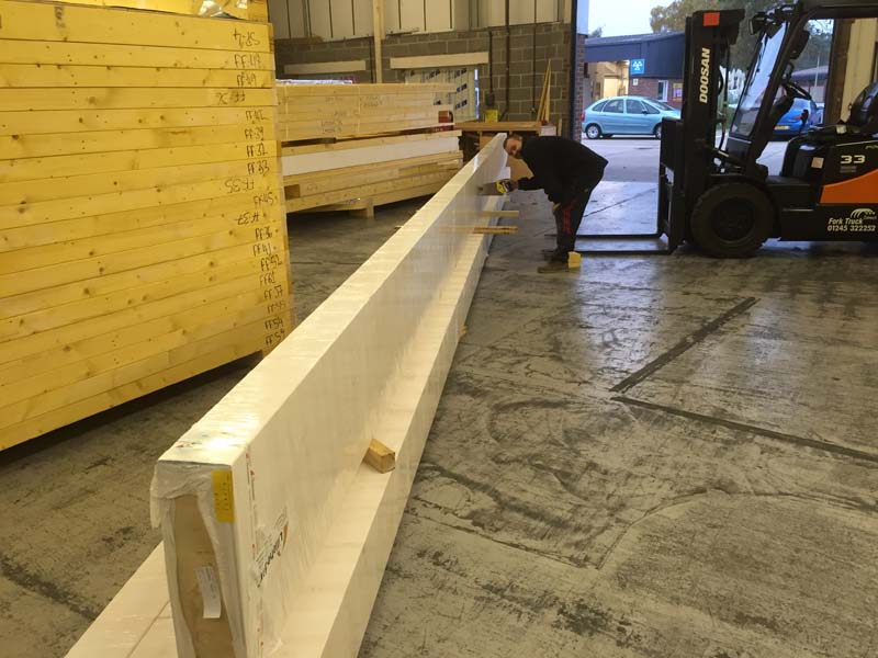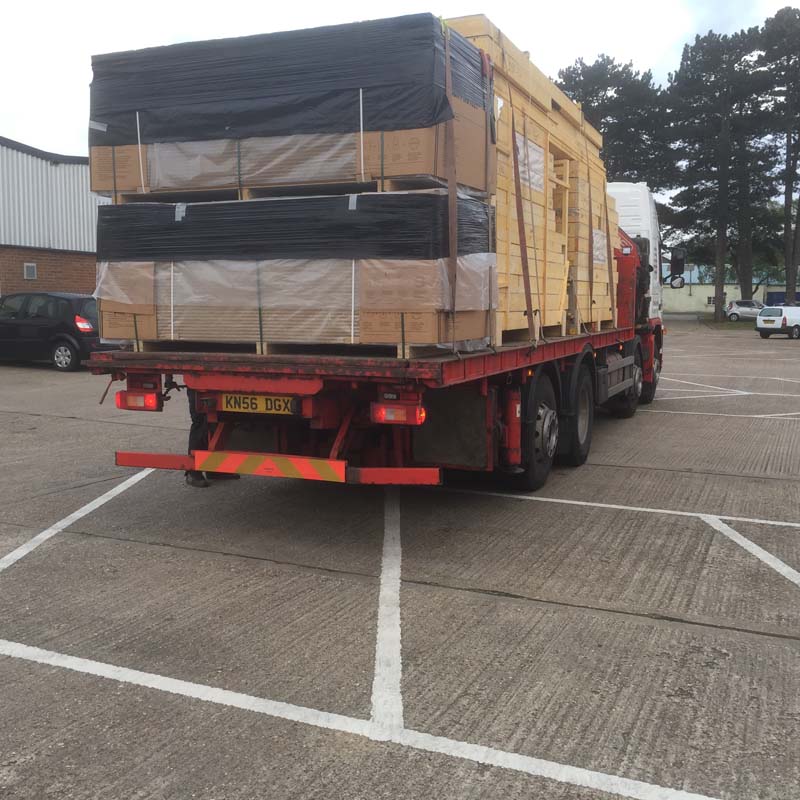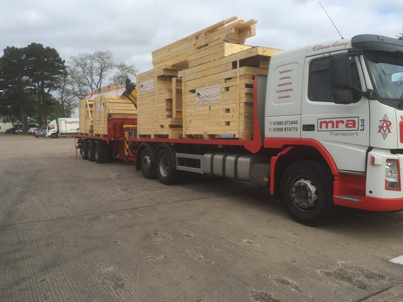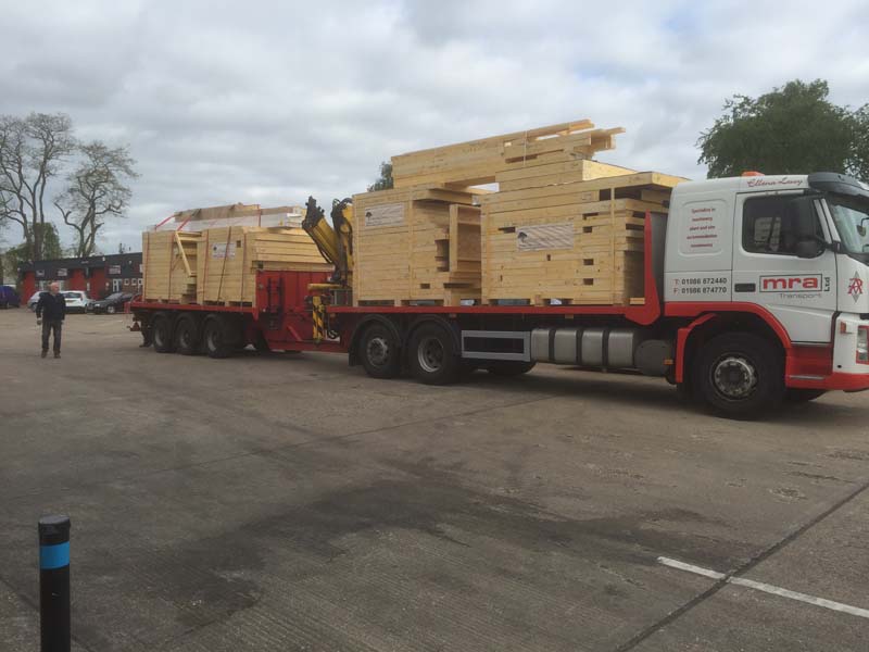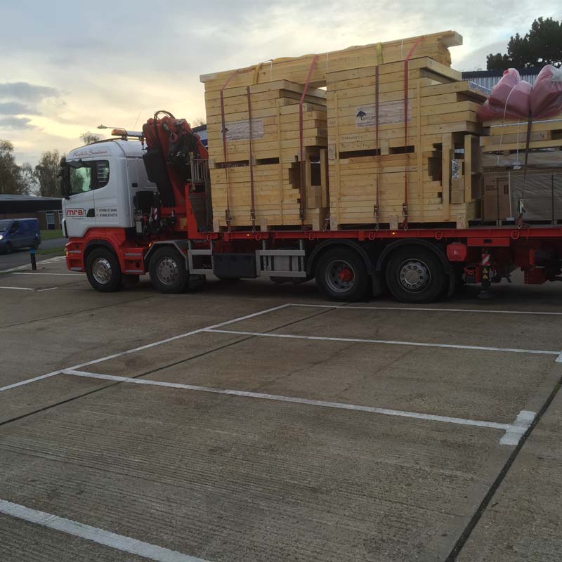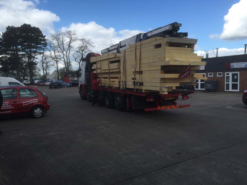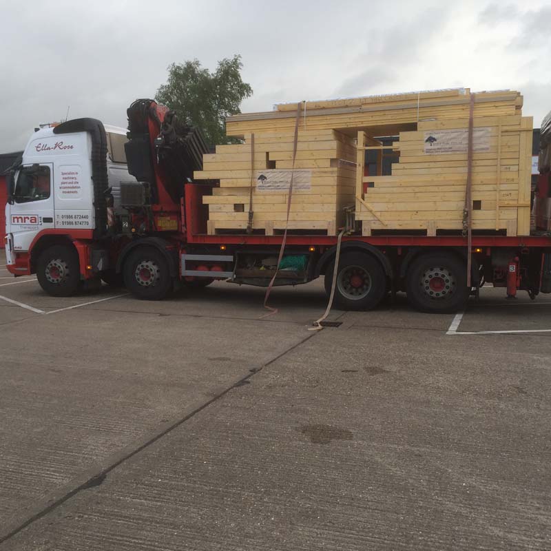 Delivery of timber frame components is transport provided by Ipswich Timber Frame’s. Each vehicle is equipped with an electronic crane. To ensure that our chain of service is completed from the design/manufacturing stage through to arrival on site on time, for our dedicated highly skilled erecting team to commence installation of the timber frame components.